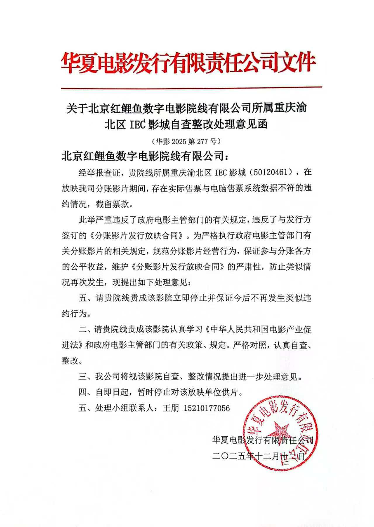 关于北京红鲤鱼数字电影院线有限公司所属重庆渝北区IEC影城自查整改处理意见函
