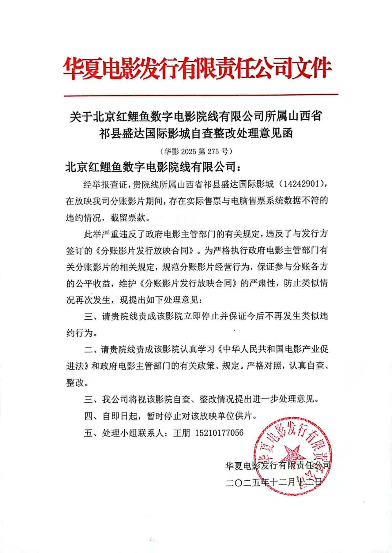 关于北京红鲤鱼数字电影院线有限公司所属山西省祁县盛达国际影城自查整改处理意见函