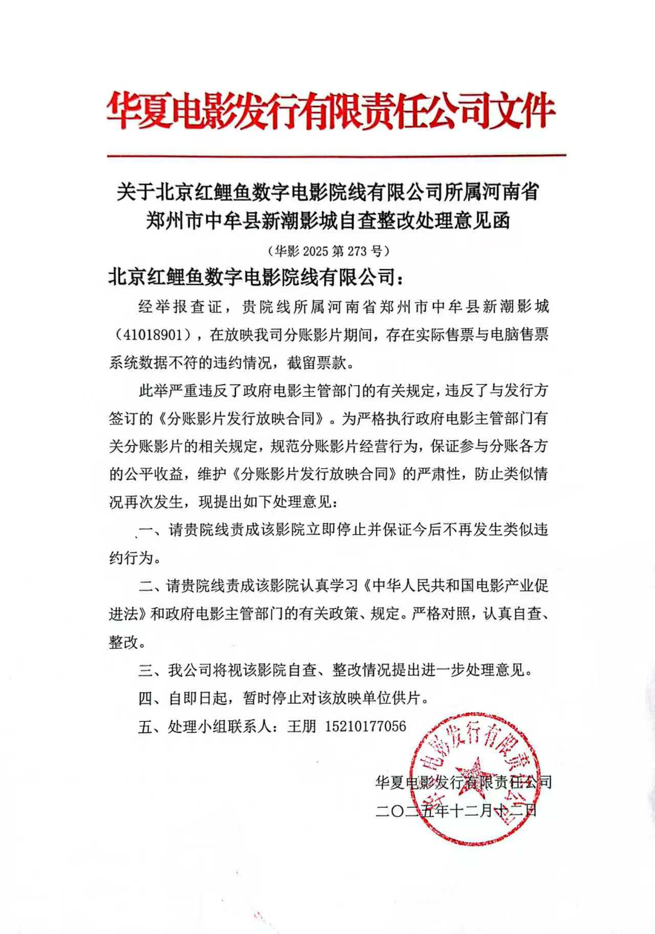 关于北京红鲤鱼数字电影院线有限公司所属河南省郑州市中牟县新潮影城自查整改处理意见函