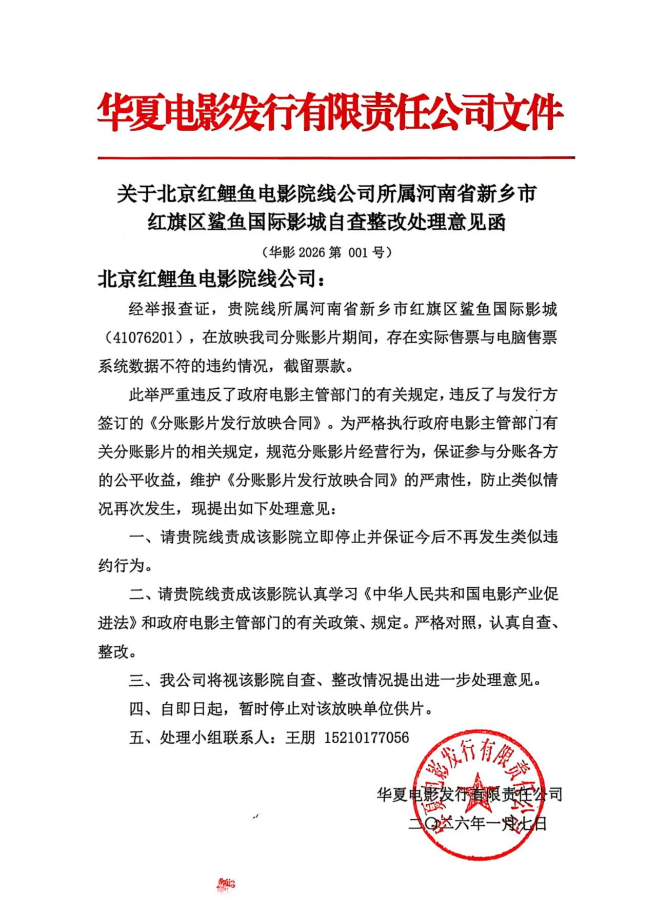关于北京红鲤鱼电影院线公司所属河南省新乡市红旗区鲨鱼国际影城自查整改处理意见函