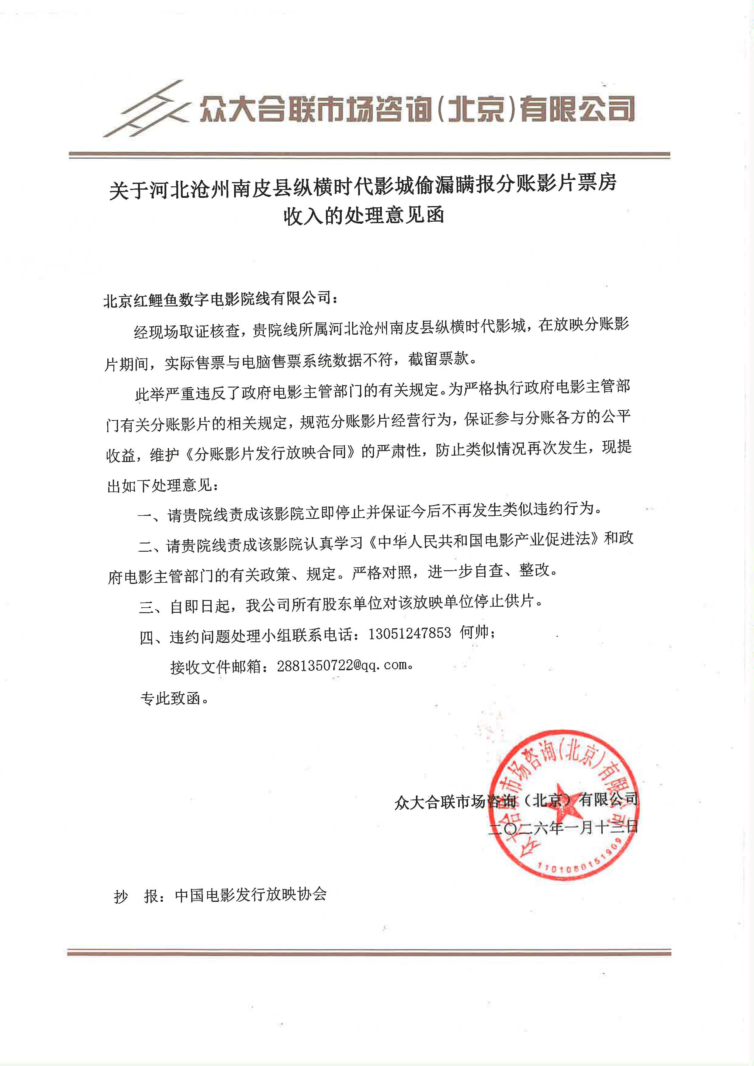关于河北沧州南皮县纵横时代影城偷漏瞒报分账影片票房收入的处理意见函