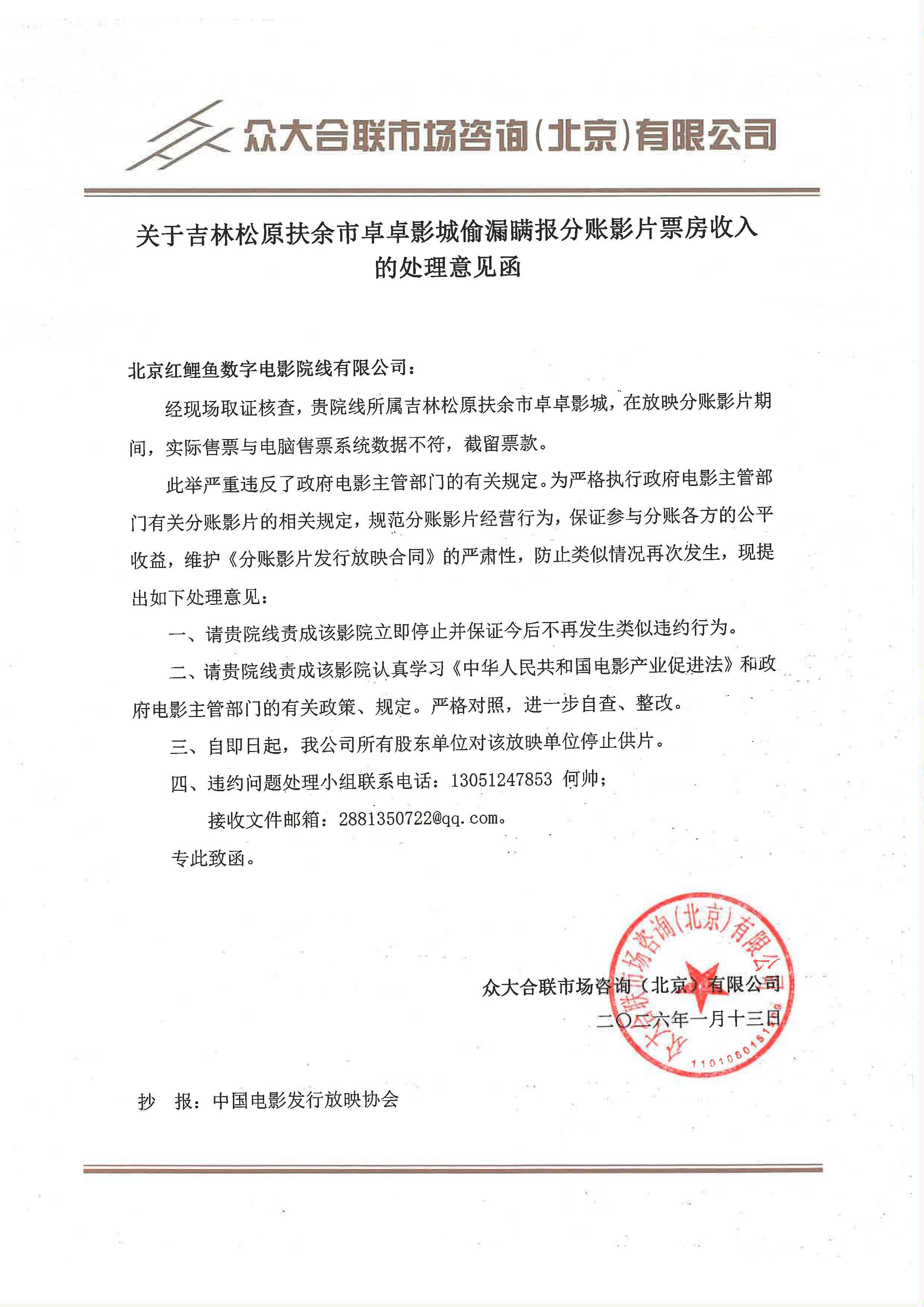 关于吉林松原扶余市卓卓影城偷漏瞒报分账影片票房收入的处理意见函