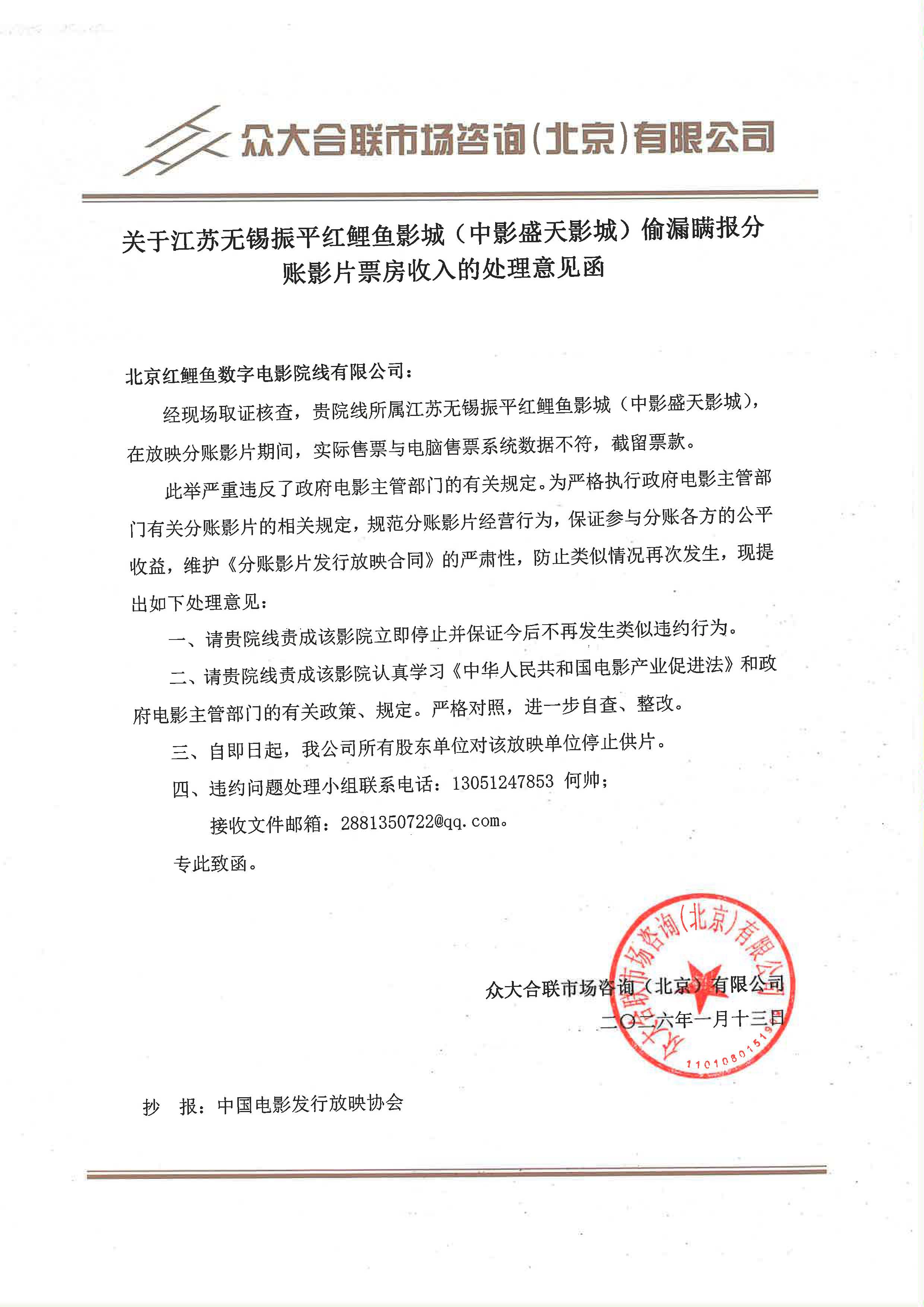 关于江苏无锡振平红鲤鱼影城(中影盛天影城)偷漏瞒报分账影片票房收入的处理意见函