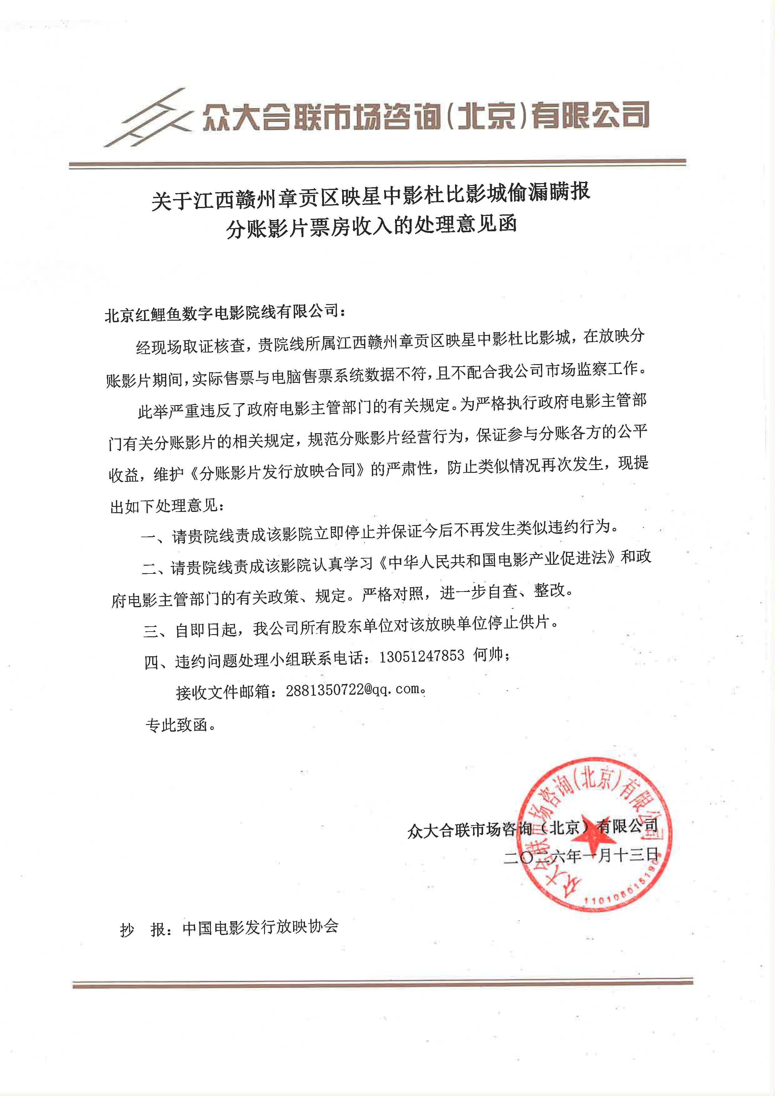 关于江西赣州章贡区映星中影杜比影城偷漏瞒报分账影片票房收入的处理意见函