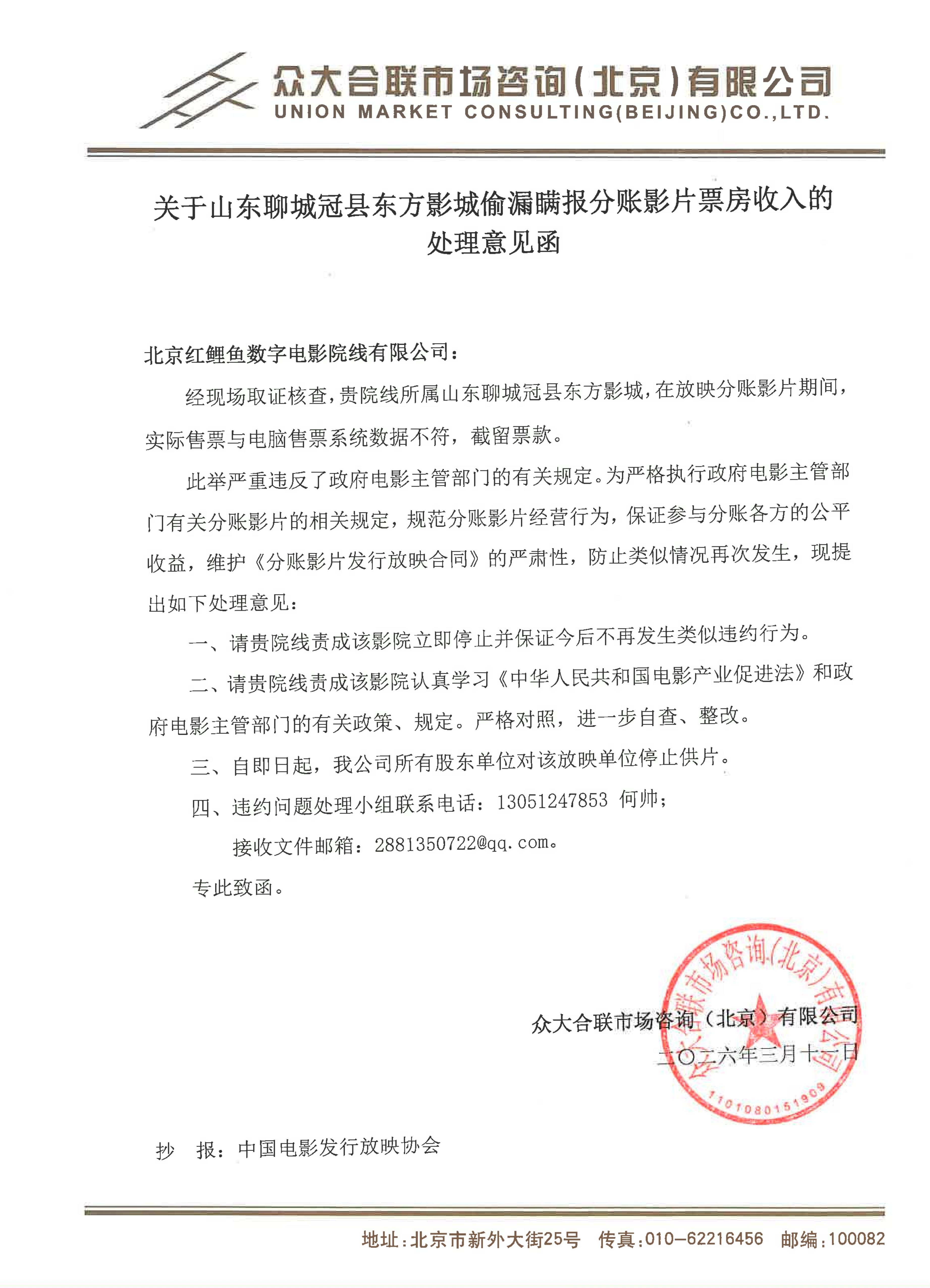 关于山东聊城冠县东方影城偷漏瞒报分账影片票房收入的处理意见函
