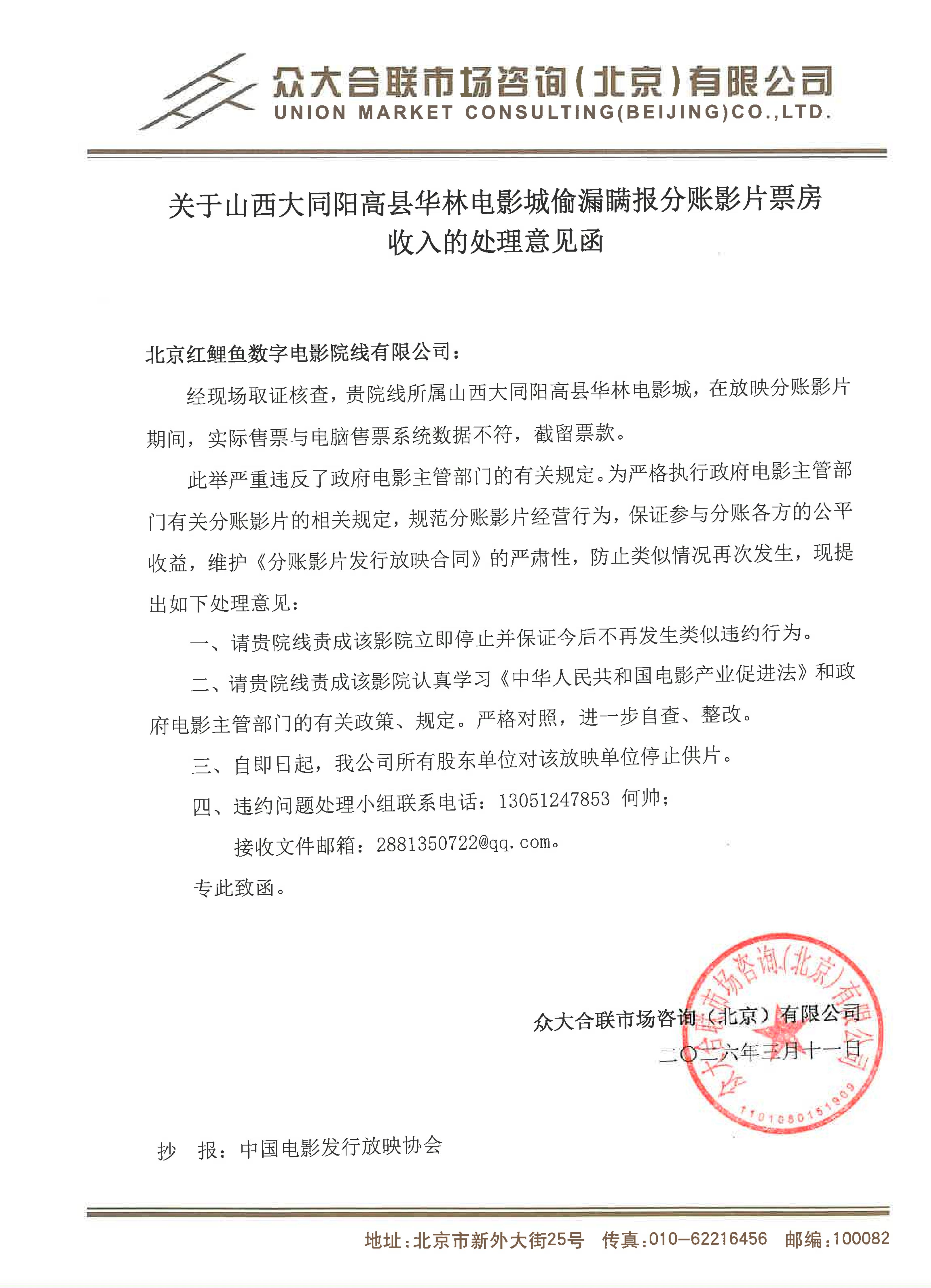 关于山西大同阳高县华林电影城偷漏瞒报分账影片票房收入的处理意见函