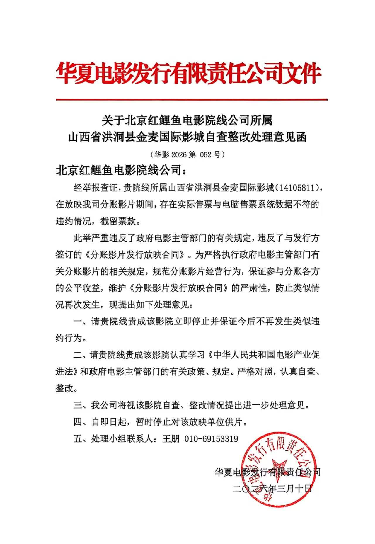 关于北京红鲤鱼数字电影院线有限公司所属山西省洪洞县金麦国际影城自查整改处理意见函