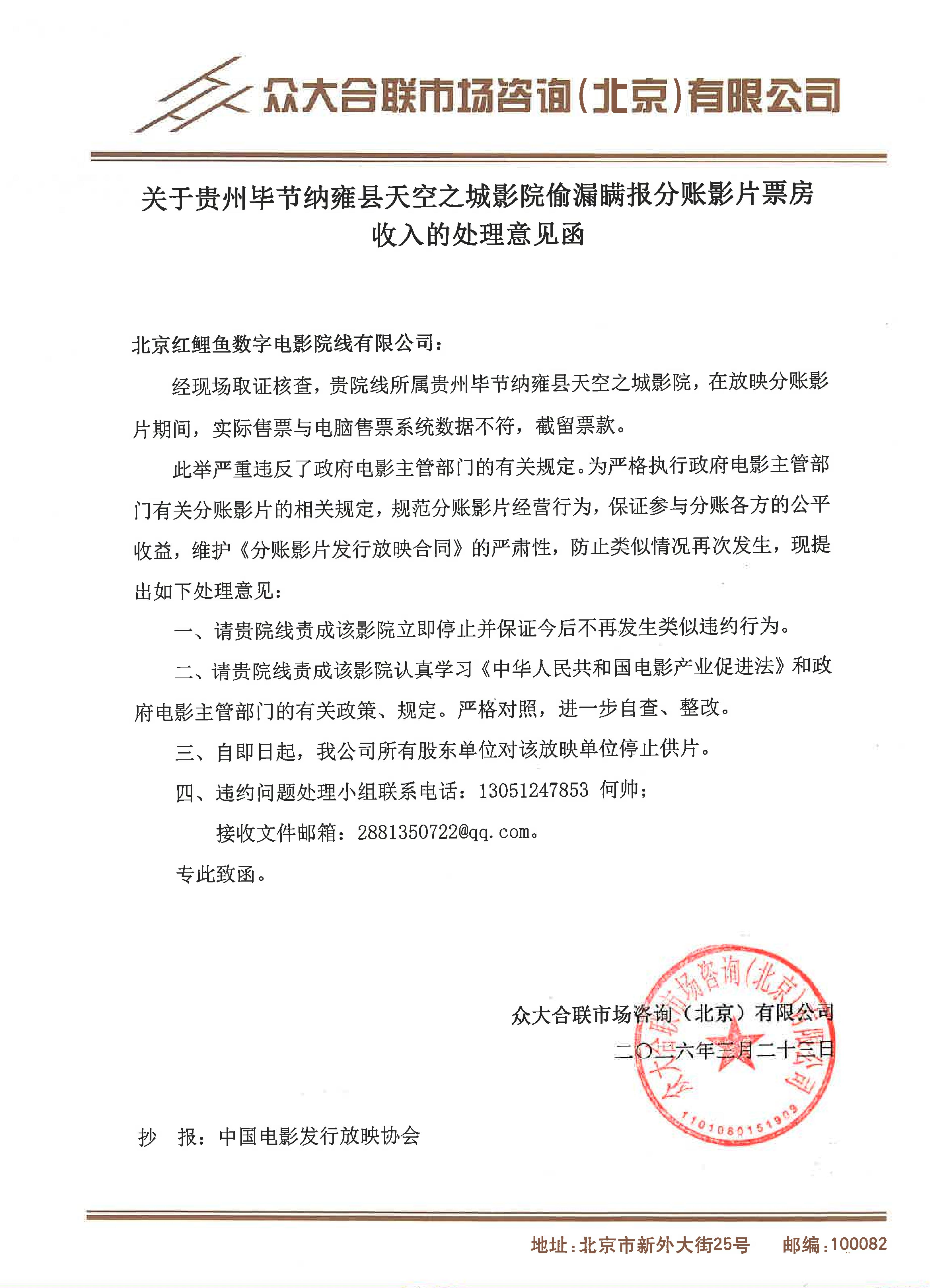 关于贵州毕节纳雍县天空之城影院偷漏瞒报分账影片票房收入的处理意见函