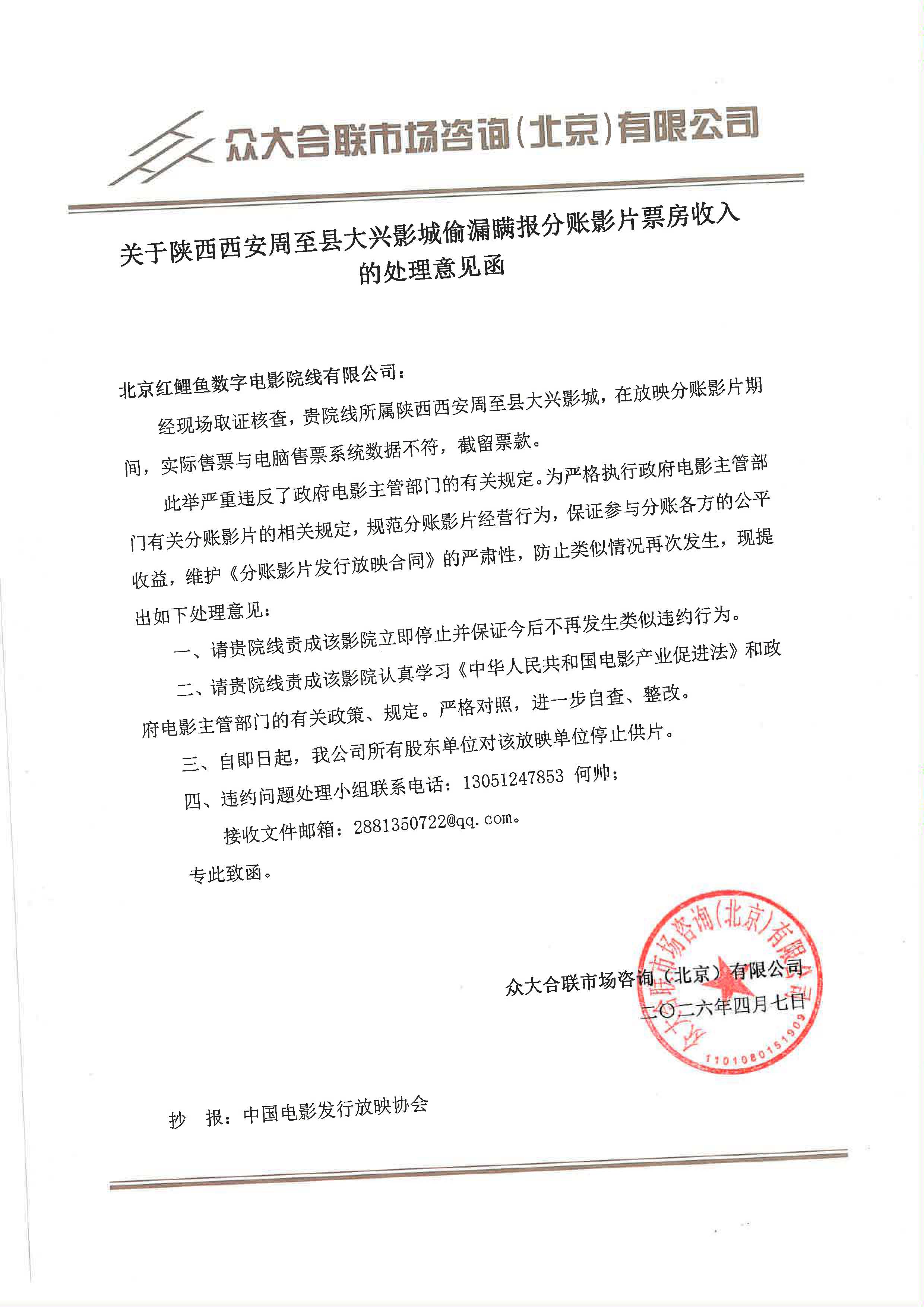 关于陕西西安周至县大兴影城偷漏瞒报分账影片票房收入的处理意见函