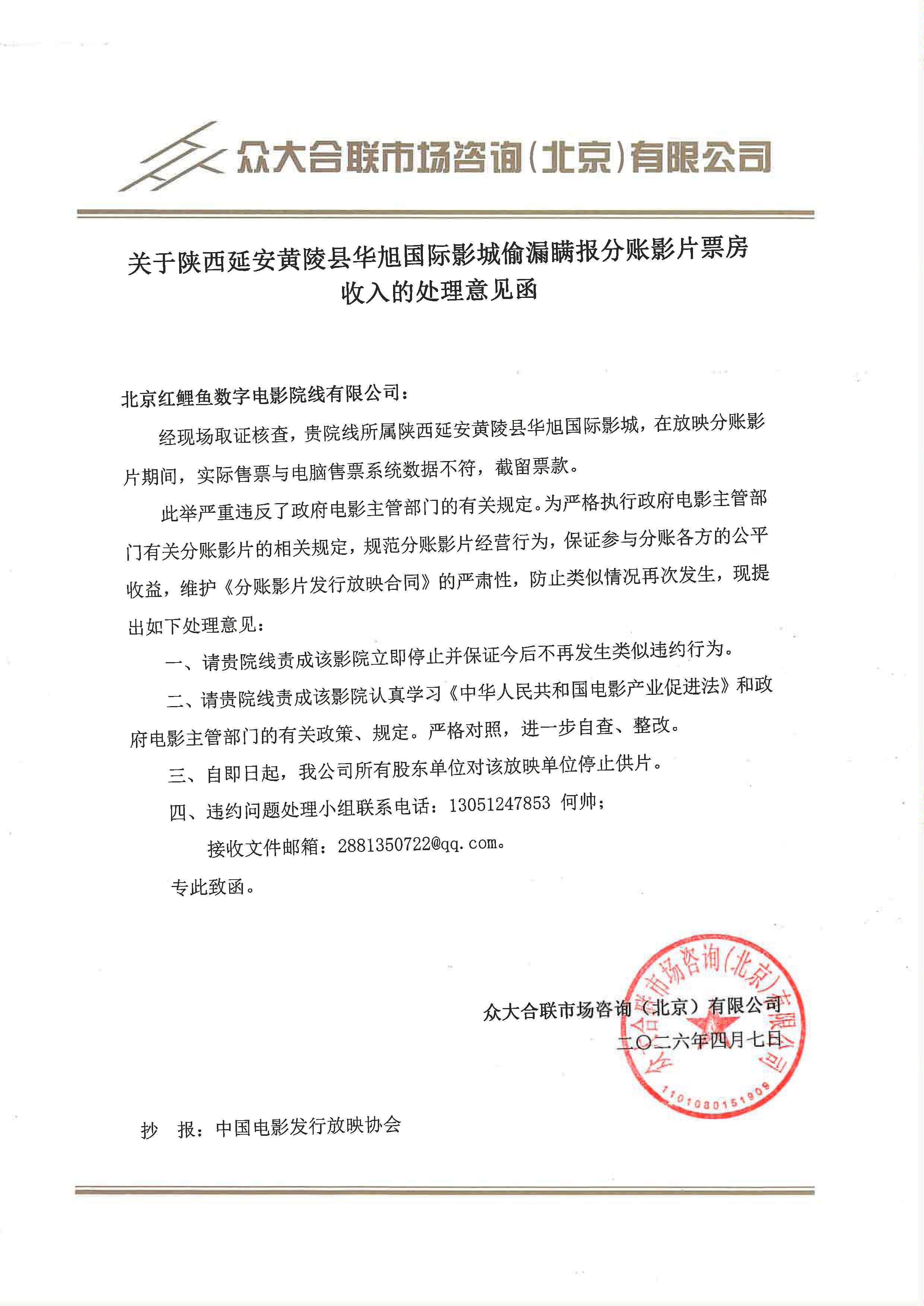 关于陕西延安黄陵县华旭国际影城偷漏瞒报分账影片票房收入的处理意见函