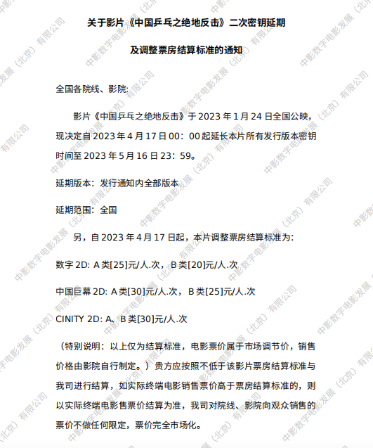 《中国乒乓之绝地反击》二次密钥延期及调整票房结算标准的通知