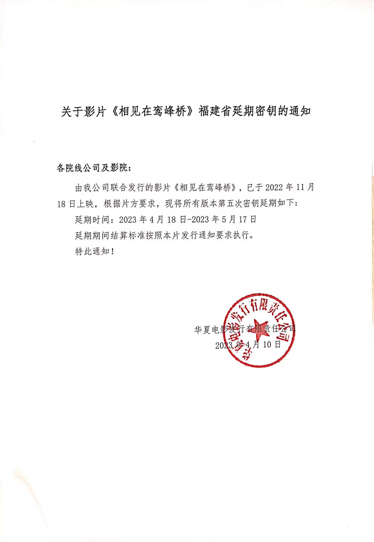 《相见在鸾峰桥》福建省密钥延期的通知