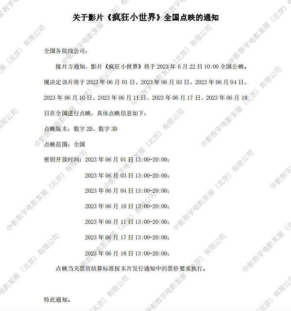 《疯狂小世界》全国点映的通知