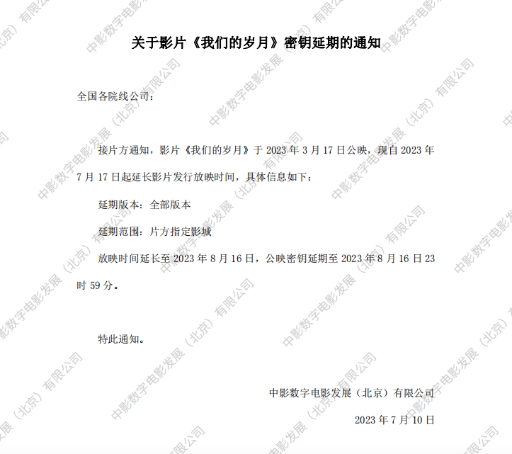 《我们的岁月》密钥延期的通知