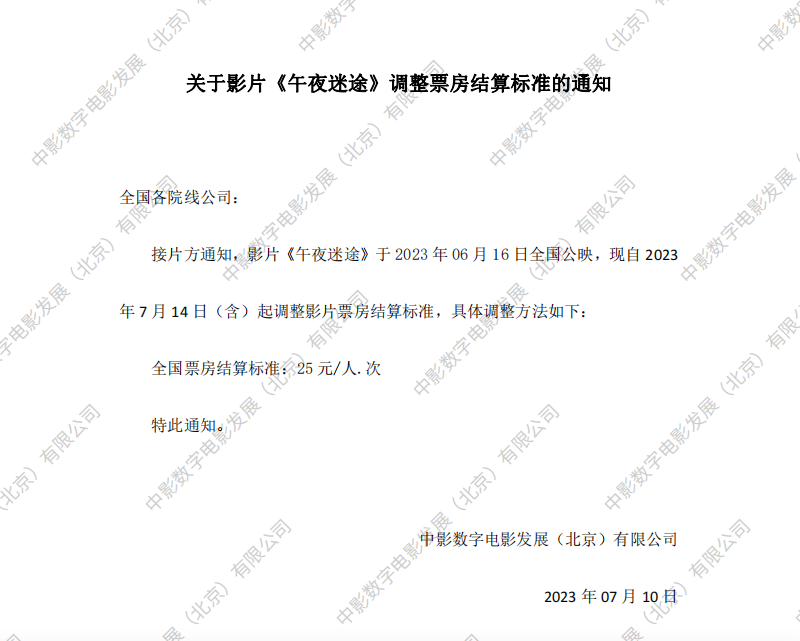 《午夜迷途》调整票房结算标准的通知