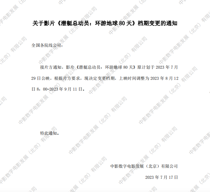 《潜艇总动员:环游地球80天》档期变更的通知