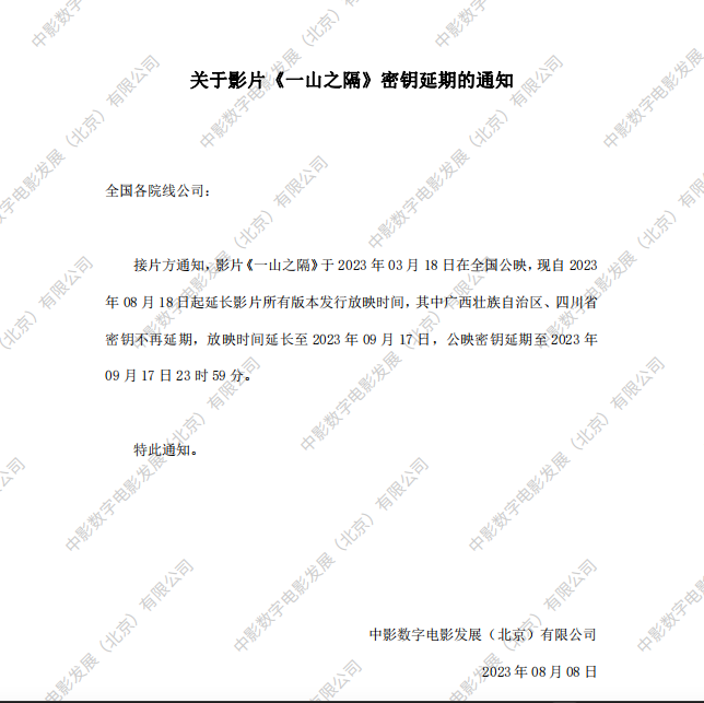 《一山之隔》密钥延期的通知