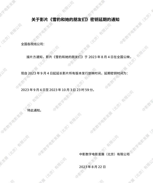 关于影片《雪豹和她的朋友们》密钥延期的通知