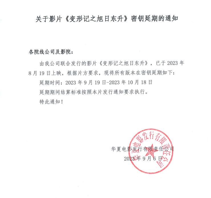 致院线-关于影片《变形记之旭日东升》密钥延期的通知