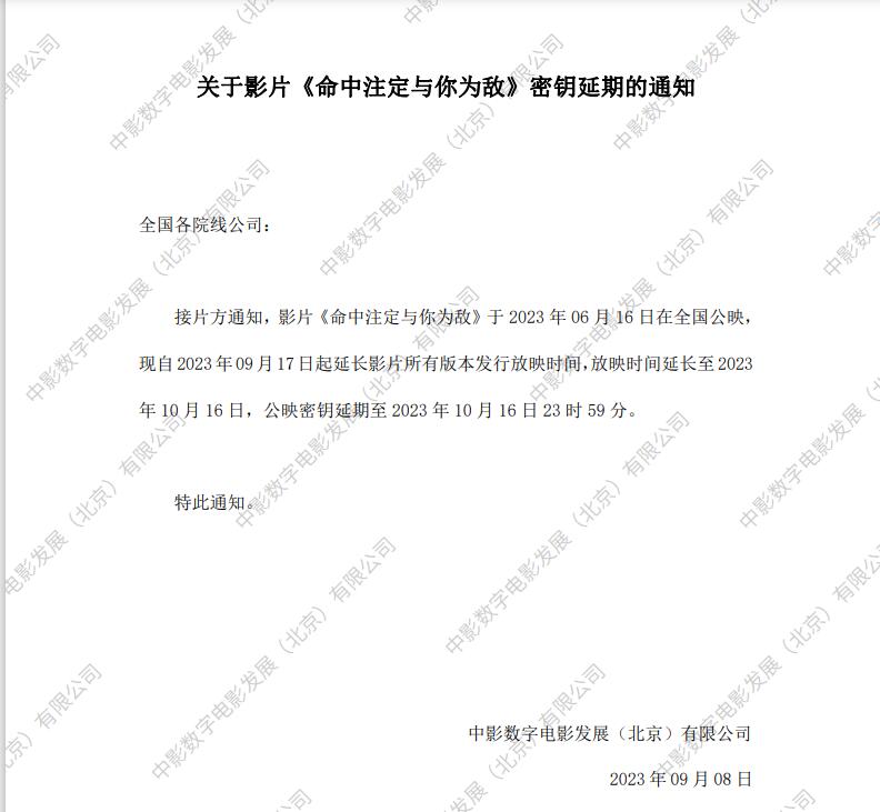 关于影片《命中注定与你为敌》3次密钥延期的通知