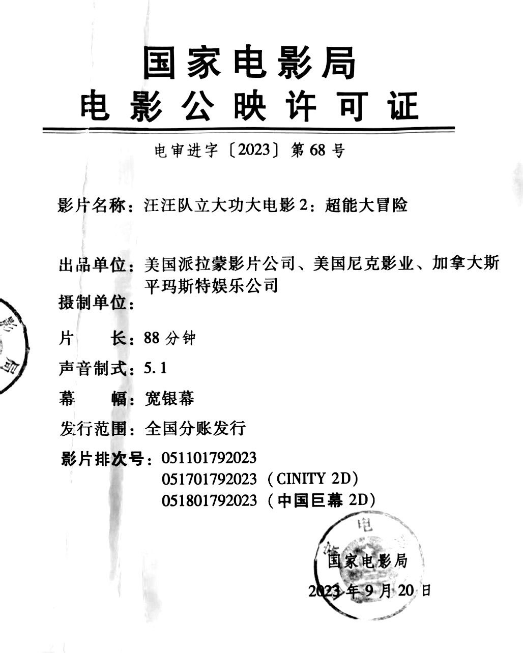 《汪汪队立大功大电影2:超能大冒险》发行通知