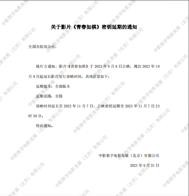 《青春如棋》密钥延期的通知