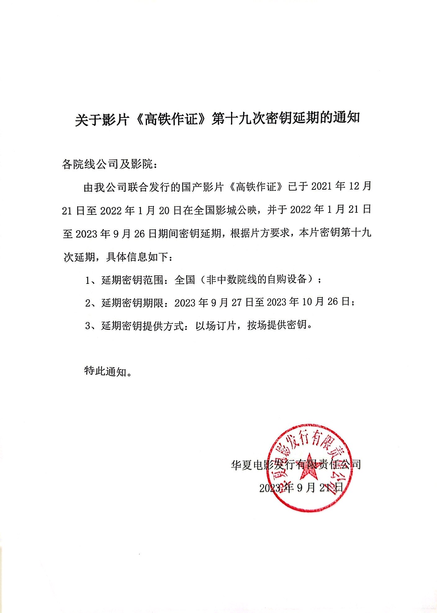 《高铁作证》第十九次密钥延期的通知