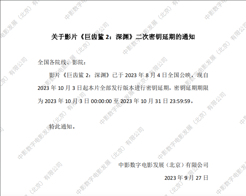 《巨齿鲨2:深渊》二次密钥延期的通知
