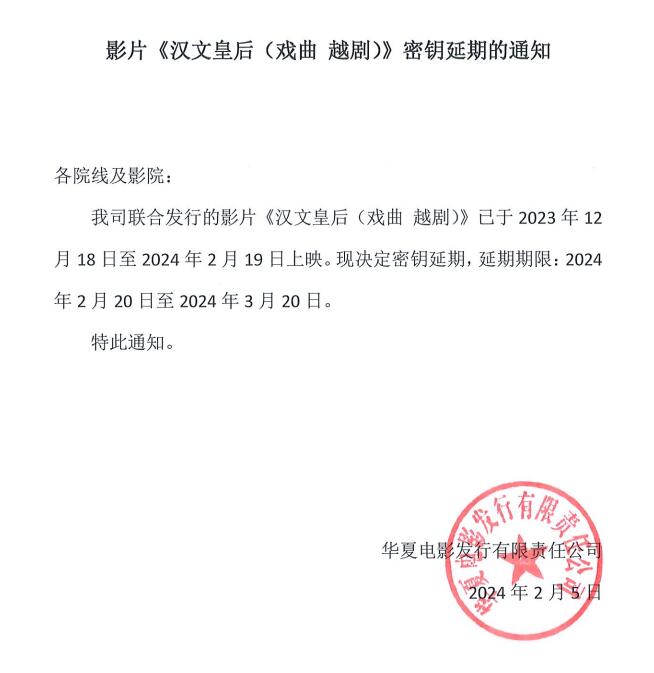 关于影片《汉文皇后(戏曲 越剧)》密钥延期的通知