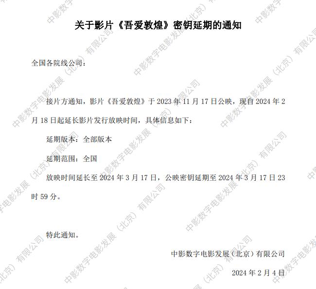 关于影片《吾爱敦煌》第三次密钥延期的通知