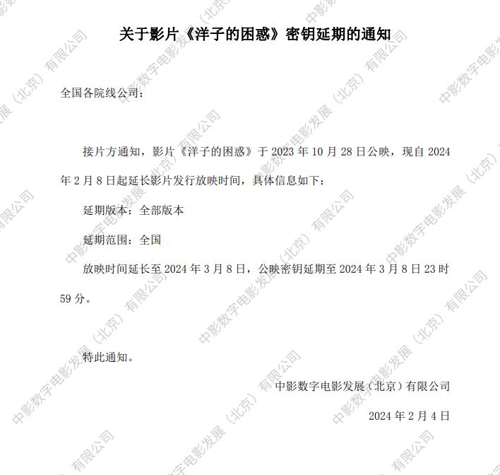 关于影片《洋子的困惑》第三次密钥延期的通知