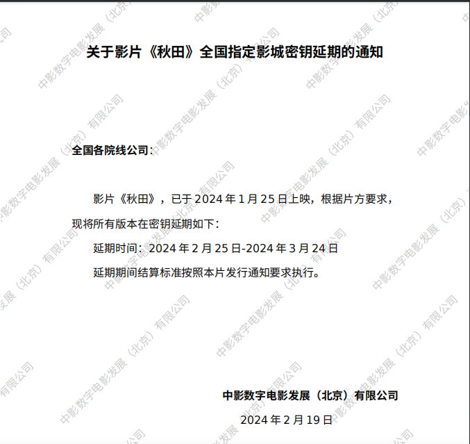 《秋田》全国指定影城密钥延期的通知