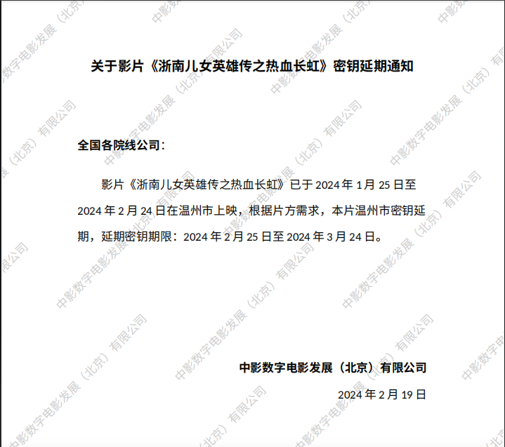 《浙南儿女英雄传之热血长虹》密钥延期的通知