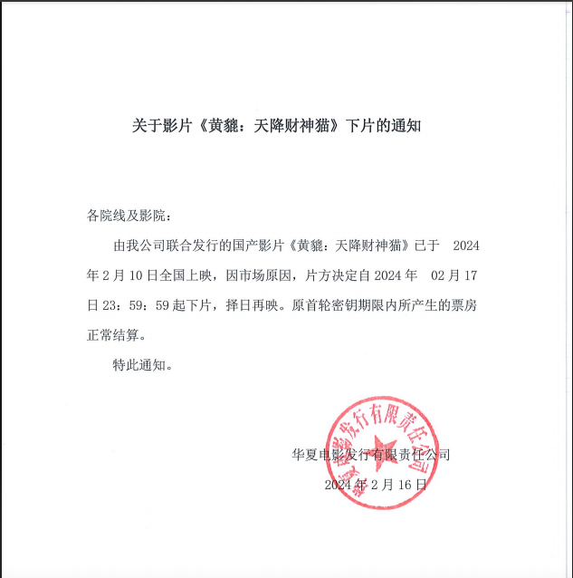 《黄貔:天降财神猫》撤档的通知