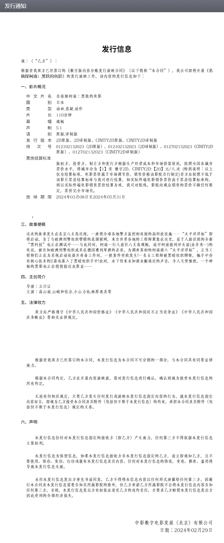 《名侦探柯南:黑铁的鱼影》发行通知(中影综合业务服务平台)