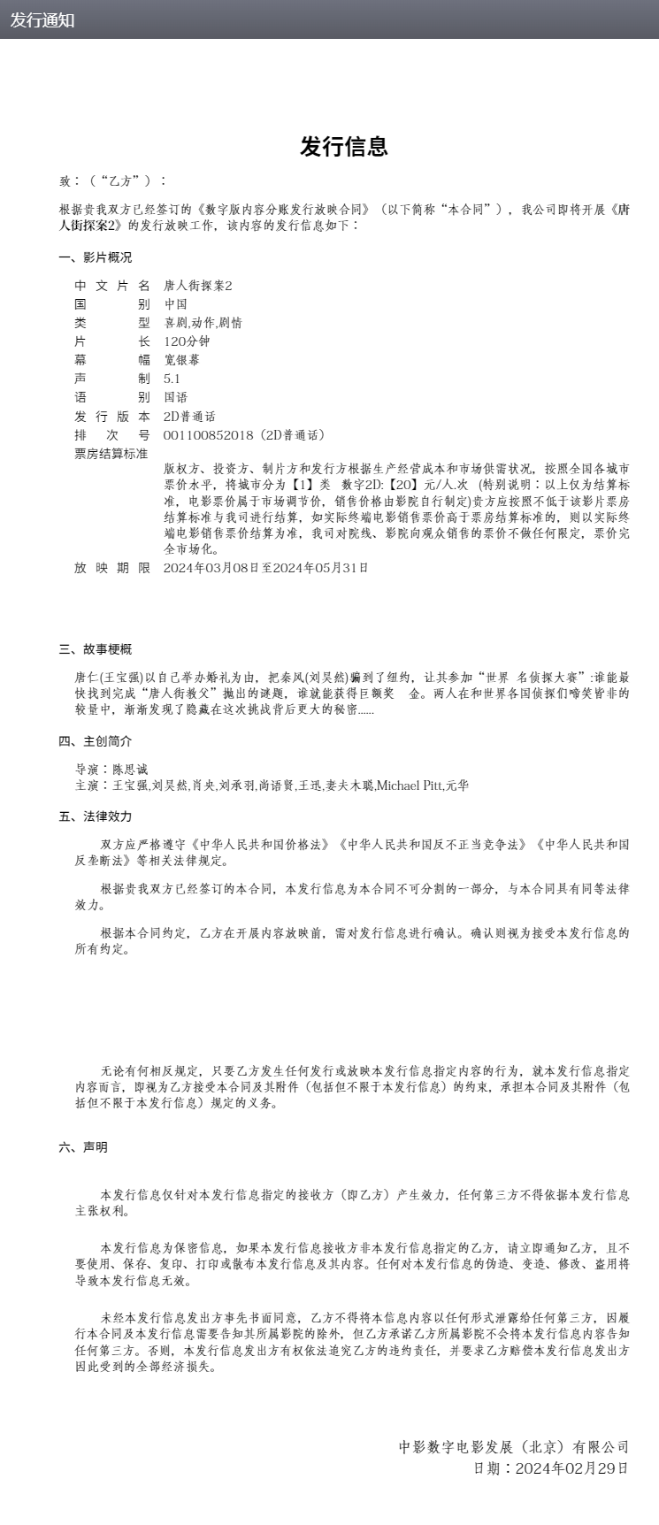 《唐人街探案2》发行通知(中影综合业务服务平台)