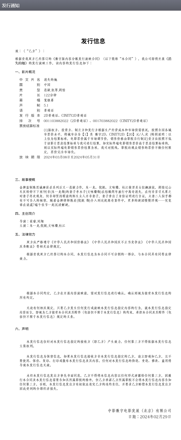 《消失的她》发行通知(中影综合业务服务平台)