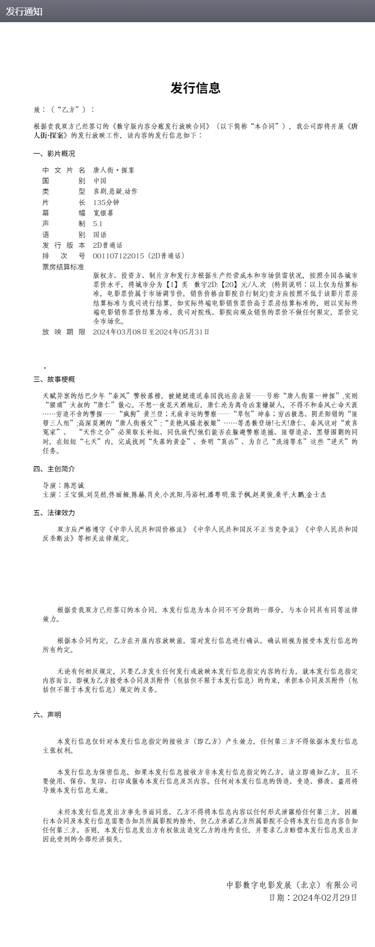 《唐人街·探案》发行通知(中影综合业务服务平台)
