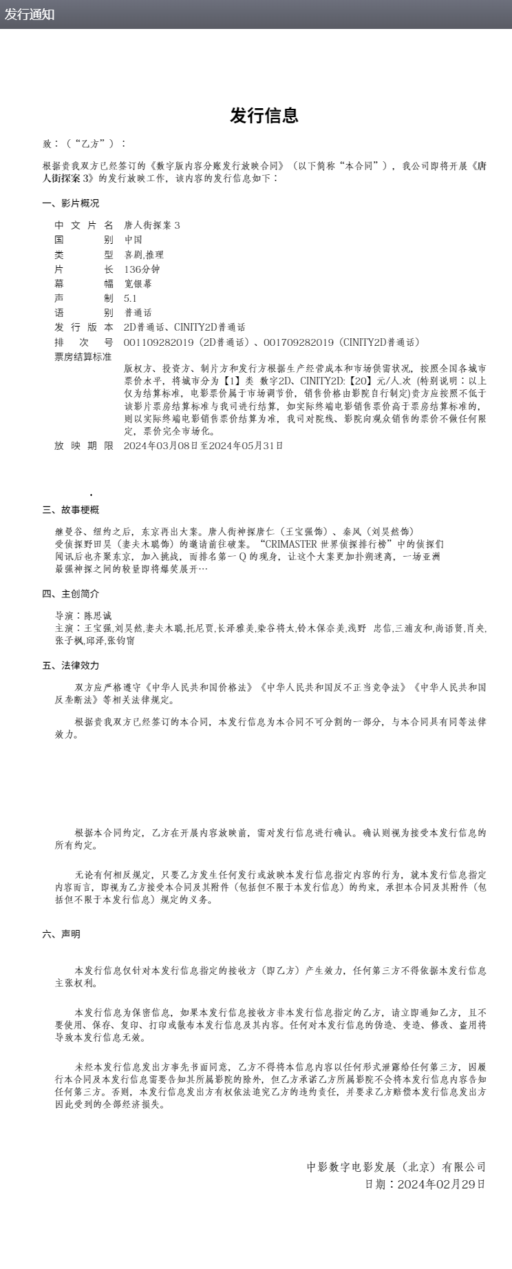 《唐人街探案 3》发行通知(中影综合业务服务平台)
