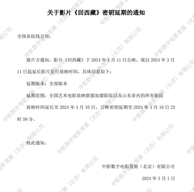 关于影片《回西藏》第二次密钥延期的通知