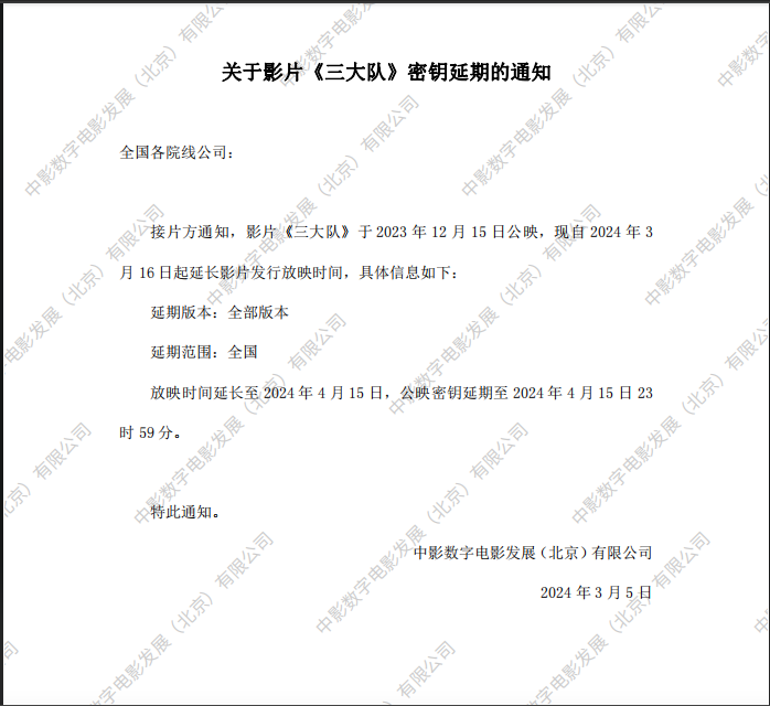 《三大队》第三次密钥延期的通知