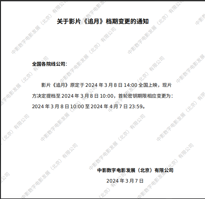 《追月》档期变更的通知