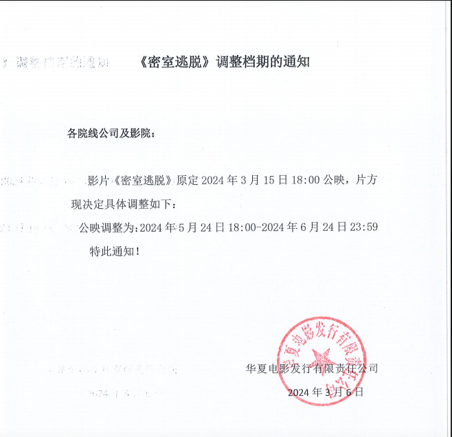 《密室逃脱》调整档期的通知