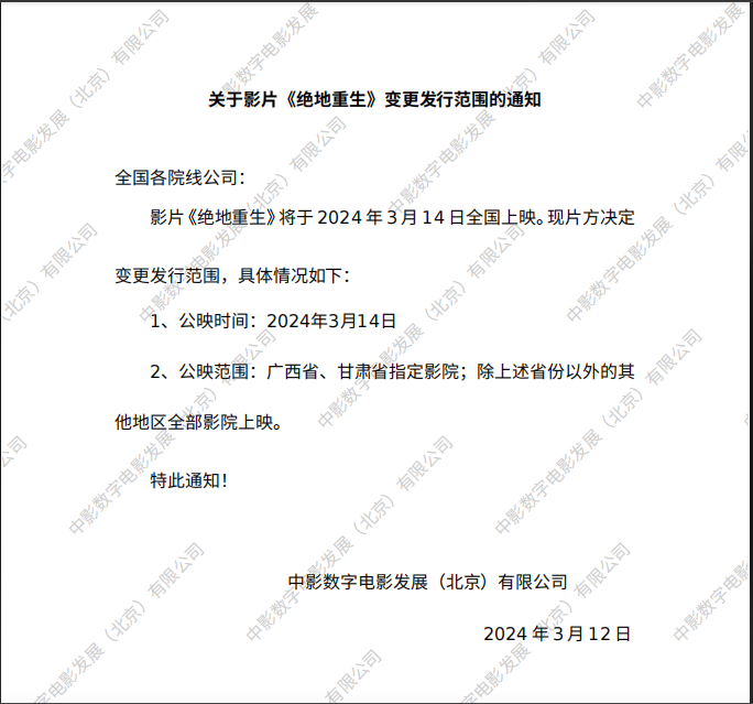 《绝地重生》变更发行范围的通知