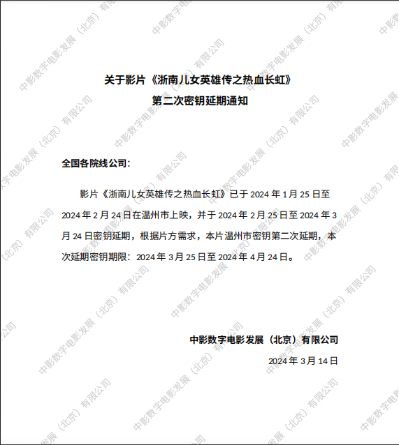《浙南儿女英雄传之热血长虹》第二次密钥延期的通知