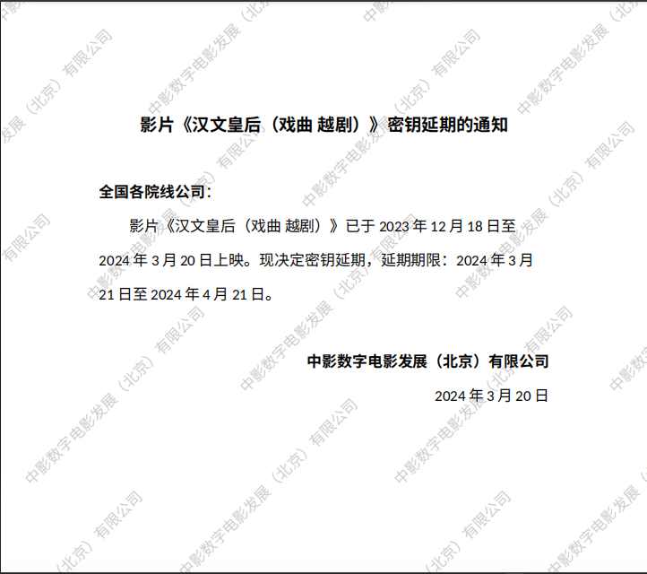 《汉文皇后(戏曲 越剧)》密钥延期的通知