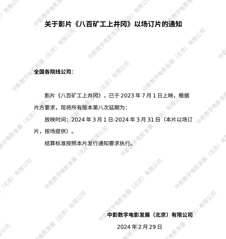 关于影片《八百矿工上井冈》第八次以场订片的通知