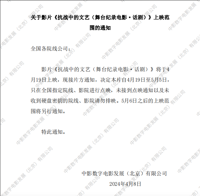 《抗战中的文艺(舞台纪录电影·话剧)》上映范围的通知