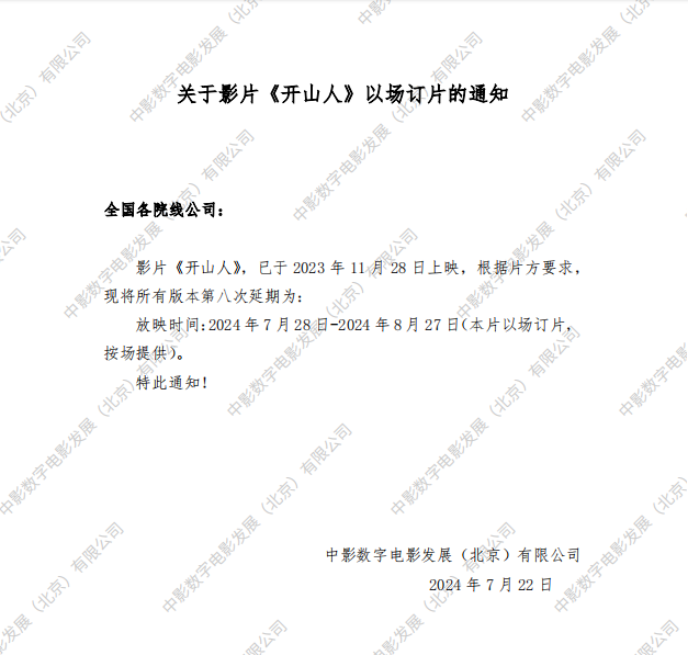 《开山人》第八次以场订片的通知