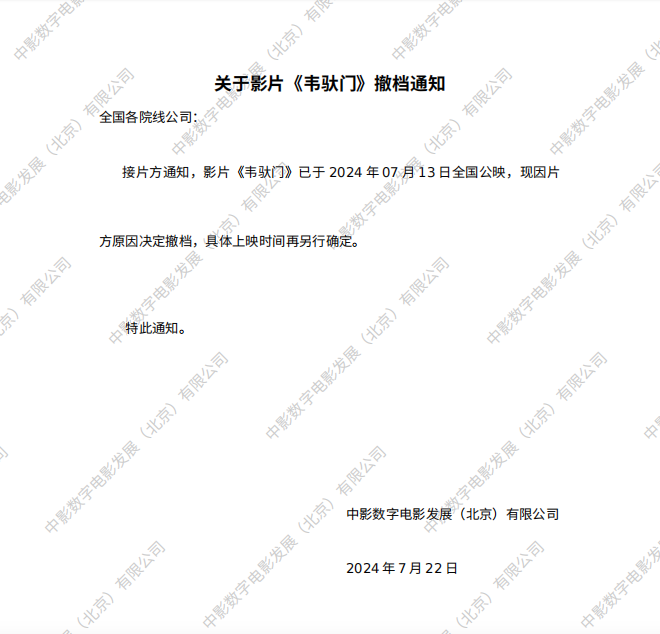 《韦驮门》撤档通知